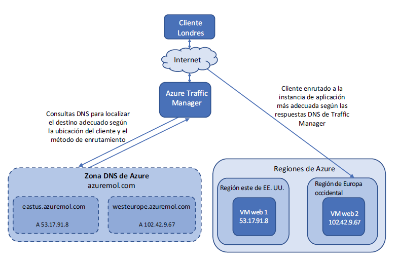 Azure Traffic Manager es un servicio de red que actúa como un destino central para sus clientes. Usemos el ejemplo de una aplicación web en la dirección www.azure-mol.com. En la figura se proporciona una visión general de cómo Traffic Manager enruta a los usuarios a la aplicación disponible más cercana.