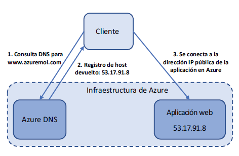 1 El usuario realiza una consulta DNS para www.azuremol.com. Su servidor DNS contacta a los servidores de nombres para azuremol.com (que podrían ser los servidores de nombres Azure si usa Azure DNS) y solicita el registro para www.
