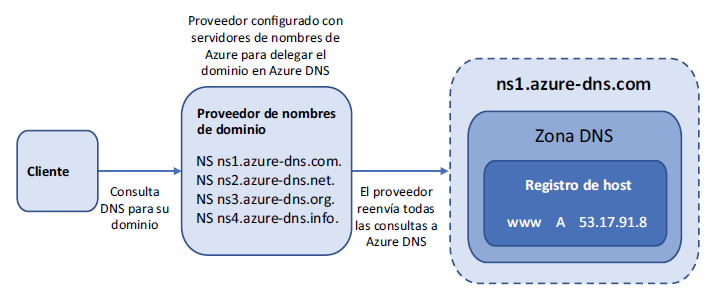 Cuando registra un dominio real, su proveedor le proporciona una interfaz de administración y herramientas para administrar ese dominio. Para permitir a los clientes acceder a sus servicios y utilizar la zona y los registros de Azure DNS, delegue la autoridad de su dominio a los servidores de nombres Azure. Esta delegación hace que todas las consultas DNS se dirijan inmediatamente a los servidores de nombres Azure, como se muestra en la figura. Actualmente, Azure no le permite comprar y registrar dominios dentro de la plataforma, por lo que necesita comprar el nombre de dominio a través de un registrador externo y luego dirigir los registros NS a los servidores de nombres Azure.