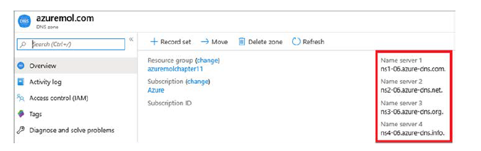 ¿Por qué delegar su DNS a Azure? Para simplificar la administración y las operaciones. Si crea servicios adicionales, ajusta la configuración del equilibrador de carga o desea mejorar los tiempos de respuesta con DNS replicado globalmente, Azure proporciona esa única interfaz de administración para completar esas tareas. Cuando sus zonas DNS se hospedan en Azure, también puede implementar algunas de las funciones de seguridad de Resource Manager que se analizan en el capítulo 6: funciones como control de acceso basado en roles (RBAC) para limitar y auditar el acceso a las zonas DNS y los bloqueos de recursos para evitar la eliminación accidental, o incluso maliciosa, de la zona.