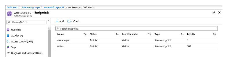 Ahora, su perfil de Traffic Manager enumera dos puntos de conexión: uno para la aplicación web en Oeste de Europa y otro para la aplicación web en Este de EE. UU., como se muestra en la figura. Ha proporcionado la misma redundancia que el perfil de Traffic Manager anterior, esta vez con todo el tráfico que va a Oeste de Europa cuando está en buen estado y Este de EE. UU. si no lo está.