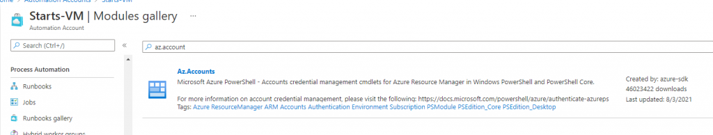 Tenemos que instalar 3 módulos adicionales, ellos son Az.Accounts, Az.Automation y Az.Compute, es solo buscar 1 a 1 e indicarle al Azure que lo importe y lo cargara de cierta forma a tu entorno.