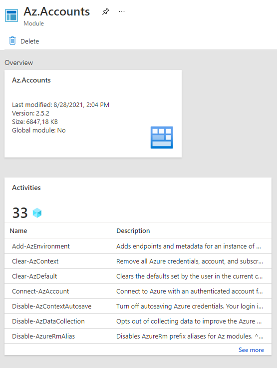 Para comprobar que el modulo esta instalado, nos vamos a la sección «Shared Resources» -> «Modules» y alli veremos todos los modulos instalados, si elegimos el que acabamos de instalar «Az.Accounts» nos mostrara la siguiente informacion e incluso nos da la opcion de quitarlo si queremos hacerlo.
