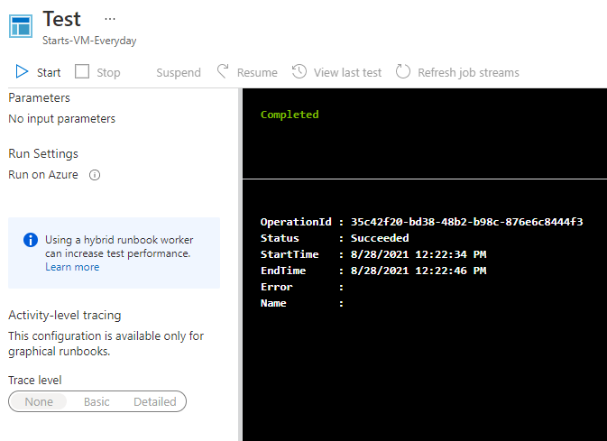 Una vez que confirmemos que ya disponemos de los modulos necesarios nos vamos una vez mas al runbooks que hemos creado, le damos a la opcion «Editar» esto a su vez nos lleva a la pantalla donde hemos editado las lineas segun la maquina o maquinas que tengamos que encender de forma automática, otra vez nos vamos al «test pane» y ahora si lo hemos realizado todo de forma correcta, al hacer la prueba debería de indicarnos que esta el runbooks de forma correcta.