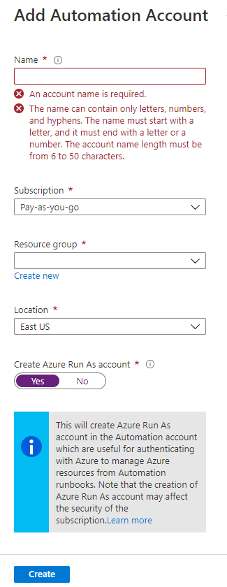 Agregamos un nombre adecuado a la tarea que va a realizar, la suscripción en caso de que tenga varias, un resource group, una localización y aquí en «Create Azure Run as Account» es importante marcarlo porque necesitaras crear o tener una cuenta de servicio que se encargue de ejecutar esta tarea cuando le establezcas las horas, luego le damos a create y ya tenemos la primera parte creada.