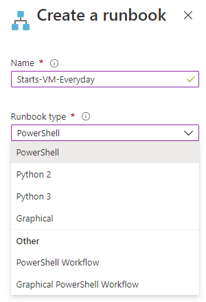Como podemos ver ya tenemos la tarea de cierta forma creada pero, no tiene función alguna definida, para esto nos vamos a donde dice «Runbooks» y desde allí vamos a crear un runbooks nuevo que se ejecute con powershell. Aunque veamos que hay varios runbooks creados de forma automática son de ejemplo en varios lenguajes como python, powershell, Graphical, ruby, etc u otros disponibles, nosotros podemos eliminarlos si queremos o dejarlos allí, para este ejemplo crearemos uno nuevo personalizado.
