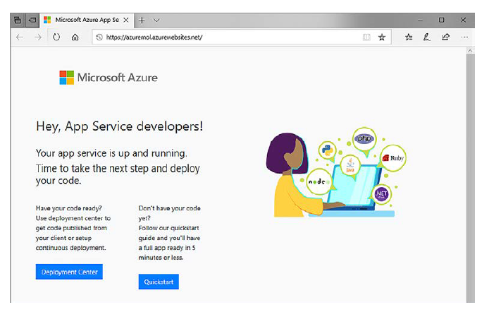 Al seleccionar la URL de la aplicación web, se abrirá una nueva ventana o pestaña del navegador. Se carga la página de la aplicación web predeterminada, como se muestra en la siguiente figura. Todavía no parece una pizzería. . .