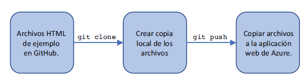 Para este ejemplo, usted crea una copia local del sitio HTML estático de ejemplo y, a continuación, inserta los archivos a la aplicación web de Azure. Este flujo de trabajo se muestra a continuación.