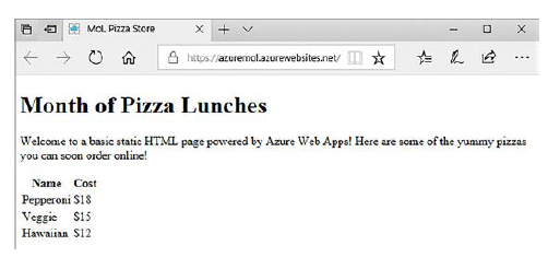 Con algo de teoría bajo la manga, echemos un vistazo a una Web App en acción. Hay un par de pasos para poner en marcha una aplicación. En primer lugar, usted crea la aplicación web básica y visualiza el sitio predeterminado en el navegador. Luego, usa la página web de GitHub de ejemplo y la inserta en Azure. Tal vez sus desarrolladores web han empezado a compilar un front-end para su pizzería en línea, así que tiene un sitio web básico listo para cargar.