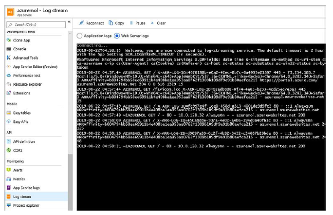Si de verdad quiere profundizar en los datos, puede acceder a los registros almacenados en el sistema de archivos mediante FTP. Las direcciones FTP se muestran en la sección Registros de descarga o en la ventana Información general de la aplicación web. Puede estar pensando: «FTP es una forma complicada de obtener registros de diagnóstico. ¿No hay una manera más fácil?» ¡Porque sí la hay! En Azure Portal, justo donde configuró sus registros de diagnóstico, hay una opción de Transmisión de registros. ¿Puede adivinar lo que hace? Déjeme darle una pista: tiene que ver con la transmisión de sus archivos de registro.