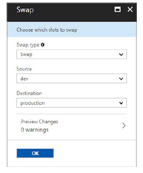 Al intercambiar ranuras, lo que estaba en vivo en la ranura production ahora está en la ranura dev y lo que estaba en dev ahora está en vivo en production. No todos los ajustes se pueden intercambiar, como la configuración SSL y los dominios personalizados; pero en su gran mayoría, las ranuras de implementación son una gran manera de organizar y validar el contenido antes de dejarlo en vivo para sus clientes. También puede realizar un intercambio con vista preliminar, lo que le da la oportunidad de garantizar que el contenido intercambiado funcione de manera correcta antes de que esté públicamente en vivo en producción.