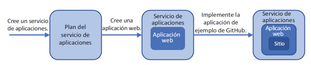 En este capítulo, vamos a comparar el enfoque de infraestructura como servicio (IaaS) de las VM y los servidores web con el enfoque de plataforma como servicio (PaaS). Aprenderá las ventajas de Azure Web Apps a medida que crea una aplicación web y verá cómo trabajar con sus versiones de desarrollo y producción. A continuación, aprenderá a implementar su aplicación web automáticamente desde un control de código fuente, como GitHub. Este flujo de trabajo se muestra en la siguiente imagen. Azure Web Apps le permite implementar y ejecutar su pizzería en línea en cosa de minutos, sin necesidad de instalar y configurar un VM ni paquetes de servidor web.