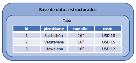 Los datos no estructurados en bases de datos NoSQL no se almacenan en tablas de filas y columnas; más bien, se almacenan en matrices dinámicas que le permiten agregar nuevas propiedades para un elemento, según sea necesario. Una gran ventaja de este enfoque es que puede agregar rápidamente un nuevo tipo de pizza o ingrediente especial sin cambiar la estructura subyacente de la base de datos. En una base de datos estructurados, es necesario agregar una nueva columna a una tabla y luego actualizar la aplicación para utilizar la columna adicional. En las bases de datos NoSQL.
