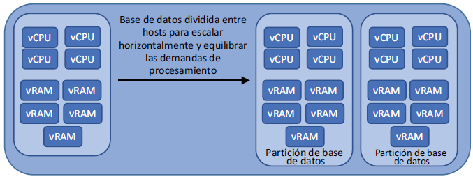 Como resultado, en una base de datos NoSQL, no es necesario que toda la base de datos quepa en la memoria de un host. Solo se necesita guardar y procesar una parte de la base de datos, una partición. Si su aplicación funciona con grandes cantidades de datos estructurados, una base de datos NoSQL puede perjudicar el rendimiento, ya que los diferentes hosts consultan sus datos para luego devolver al cliente. Si tiene una gran cantidad de datos no estructurados que procesar, las bases NoSQL pueden optimizar el rendimiento o, al menos, ofrecen la ventaja de administración y eficiencia. En la figura se muestra un ejemplo de cómo las bases de datos no estructurados escalan horizontalmente entre hosts.