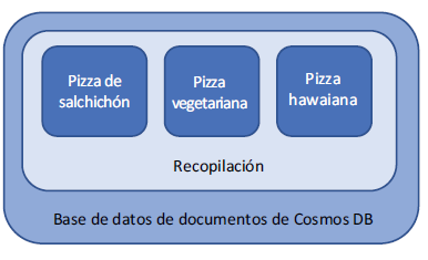 En las bases de datos de Cosmos DB que utilizan el modelo de documento, la información se agrupa lógicamente en contenedores denominados colecciones. Otros modelos de API tienen un nombre ligeramente diferente para la entidad de contenedor, como graph para la API de Gremlin. Para nuestra API de SQL, las colecciones almacenan datos relacionados que se pueden indexar y consultar rápidamente, como se muestra en la figura. Las colecciones no son totalmente diferentes de cómo se organiza una base de datos SQL tradicional en tablas, pero ofrecen mucha más flexibilidad a la hora de distribuir los datos para rendimiento o redundancia.
