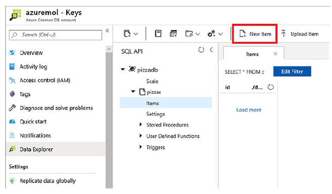 Ahora tiene una cuenta de Cosmos DB, una base de datos y una colección, pero Cosmos DB todavía no contiene sus pizzas. Puede importar algunos datos o escribir código que incorpora una gran cantidad de datos. Vamos a crear manualmente tres pizzas para explorar algunas de las herramientas gráficas incorporadas en Azure Portal para buscar, consultar y manipular los datos en su base de datos de Cosmos DB.