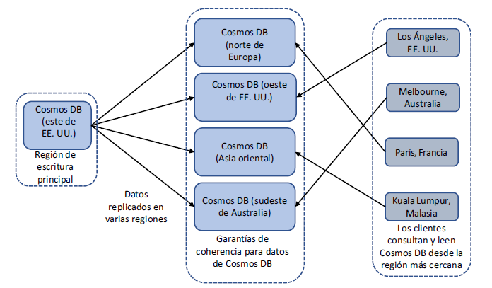 Hay un equilibrio entre una distribución geográfica más limitada, como el modelo de coherencia fuerte y una replicación geográfica más amplia que ofrece el modelo de coherencia definitiva, pero entendiendo que hay un ligero retraso mientras se replican los datos. También hay costos relacionados con el ancho de banda y con el procesamiento, dependiendo de la coherencia y la frecuencia con que desea que se repliquen los datos. La plataforma Azure maneja la replicación subyacente de los datos desde su punto de escritura; no es necesario que compile sus aplicaciones para replicar los datos o determinar la mejor manera de leer los datos desde los puntos de conexión replicados.