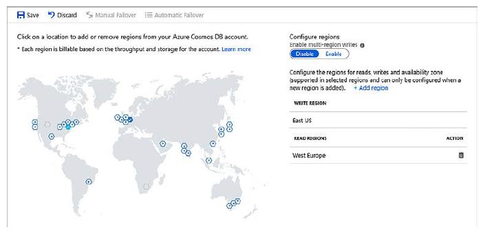 – Descubrimiento automático del punto de conexión: el SDK lee todos los puntos de conexión disponibles de Cosmos DB y utiliza el orden de conmutación por error especificado. Este enfoque asegura que su aplicación siempre siga el orden que especifique en la base de datos. Por ejemplo, es posible que desee que todas las lecturas pasen por el Este de EE. UU. y solo utilizar Oeste de Europa cuando haya mantenimiento en la ubicación principal.