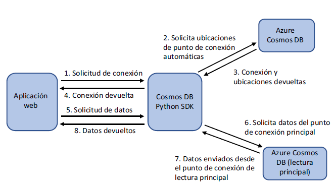 En su gran mayoría, la plataforma Azure determina la mejor ubicación para hablarle a su aplicación. Una aplicación normalmente necesita leer y escribir datos. Puede definir las directivas de conmutación por error para su base de datos de Cosmos DB que controla la ubicación de escritura principal. Esta ubicación de escritura actúa como el nodo central para garantizar que los datos se repliquen uniformemente en todas las regiones. Pero su aplicación web puede normalmente leer de varias regiones disponibles para acelerar las consultas y devolver datos al cliente. Todo esto es manejado por llamadas REST.