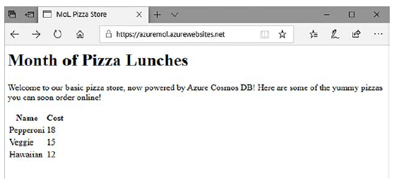12 Abra esta URL en un navegador web para ver su pizzería, que ahora está basada en Cosmos DB.