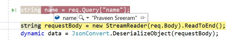 - Después de escribir la dirección URL correcta de la Azure Function, en cuanto presionamos la tecla Entrar en la barra de direcciones del navegador, el depurador de Visual Studio también ejecuta el punto de depuración (si dispones de uno), como se muestra en la siguiente captura de pantalla: