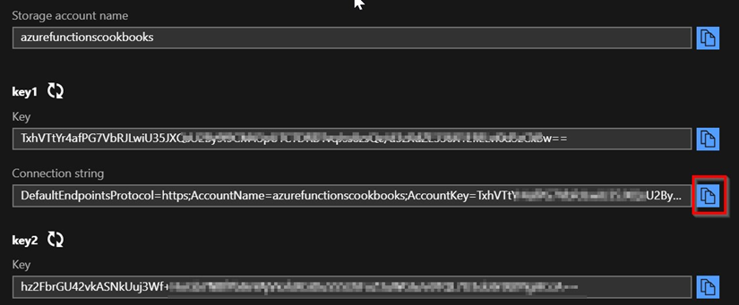 - Si recuerdas la receta Crear una API web back-end mediante desencadenadores de HTTP del capítulo 1, Desarrollar aplicaciones en el cloud mediante desencadenadores y enlaces de funciones, el portal de administración de Azure nos permite seleccionar entre una cuenta de almacenamiento nueva o una existente. Sin embargo, el cuadro de diálogo anterior no está conectado a tu suscripción de Azure. Por lo tanto, debes ir a la cuenta de almacenamiento y copiar la cadena de conexión, que se puede encontrar en la hoja Claves de acceso de la cuenta de almacenamiento en el portal de administración de Azure, como se muestra en la siguiente captura de pantalla: