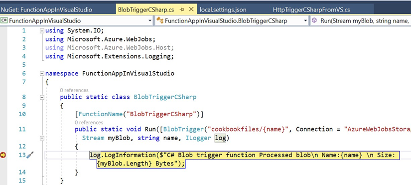 En una de las recetas anteriores, Cómo conectarse al cloud de Azure Storage desde el entorno local de Visual Studio, has aprendido a conectar la cuenta en el cloud desde el código local. En esta receta, aprenderás a depurar el código activo que se ejecuta en el entorno de Azure Cloud. Vamos a seguir estos pasos en la función BlobTriggerCSharp de la aplicación de función FunctionAppinVisualStudio: