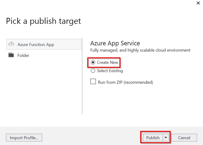 Hasta ahora, nuestra aplicación de función es solo una aplicación normal dentro de Visual Studio. Para implementar la aplicación de función junto con sus funciones, o bien tenemos que crear los siguientes recursos nuevos o bien seleccionar los recursos existentes para hospedar la nueva aplicación de función: