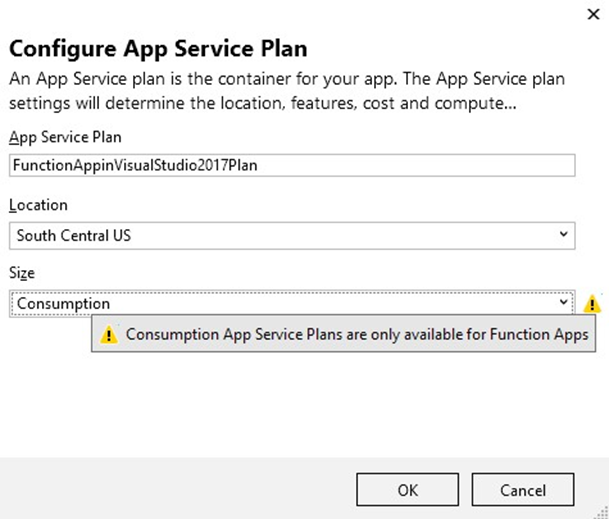 Realizar todas las funciones del entorno sin servidor solo se puede lograr al crear la aplicación de función, seleccionando el plan Consumo en el menú desplegable Plan de hosting.