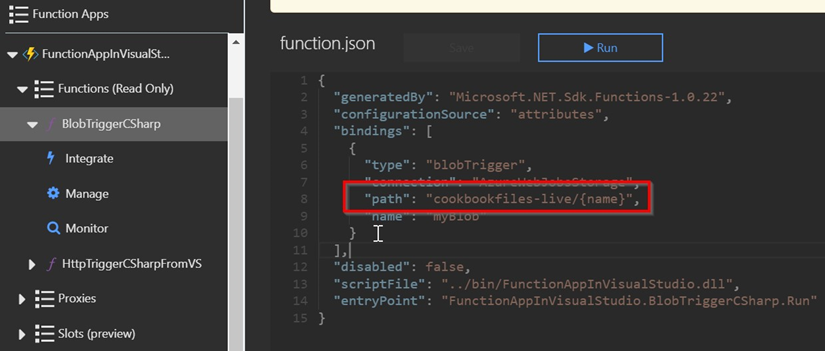 - Ve a la función BlobTriggerCSharp en el portal de administración de Azure y cambia la ruta de la variable path para apuntar al nuevo contenedor cookbookfiles-live. Luego, vuelve a publicarla. Debe parecerse a cómo se muestra en la siguiente captura de pantalla: