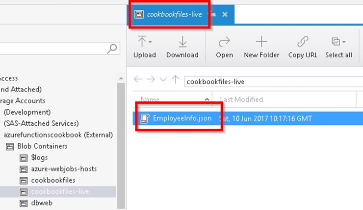 - Ve al explorador de Storage y carga un archivo nuevo (en este caso, he cargado EmployeeInfo.json) en el contenedor cookbookfiles-live, como se muestra en la siguiente captura de pantalla: