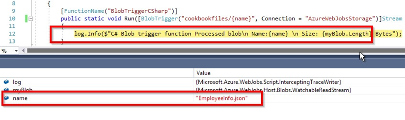 En esta clase BlobTriggerCSharp, el método Run tiene los atributos de WebJobs con una cadena de conexión (en este caso, es AzureWebJobsStorage). Esto indica al runtime que consulte la cadena de conexión de Azure Storage en el archivo de configuración de opciones local con la clave nombrada después de la cadena de conexión AzureWebJobsStorage. Cuando el host de trabajo se empieza a ejecutar, usa la cadena de conexión y mantiene el control de los contenedores de las cuentas de almacenamiento que hemos especificado. Cada vez que se agrega o actualiza un nuevo blob, desencadena automáticamente el desencadenador de blob en el entorno actual.