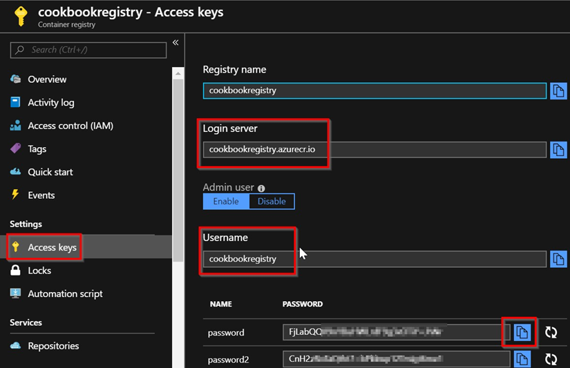 - Una vez creado el ACR correctamente, desplázate a la hoja Claves de acceso y anota el servidor de inicio de sesión, el nombre de usuario y la contraseña, que aparecen resaltados en la captura de pantalla siguiente. Estos campos los utilizarás más adelante en esta receta: