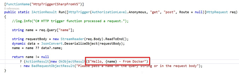 Antes de comenzar, hagamos un pequeño cambio en HTTPTrigger, para que entendamos que el código se está ejecutando desde Docker, como se resalta en la siguiente imagen. Para ello, acabo de agregar un mensaje de Docker a la salida, de la siguiente manera: