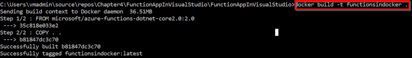 - A continuación, ve al símbolo del sistema y ejecuta el siguiente comando de Docker, docker build -t functionsindocker; no te olvides de incluir el punto al final del comando para crear una imagen de Docker. Después de ejecutar el comando docker build, el resultado debe ser algo parecido a lo que se muestra en la siguiente captura de pantalla: