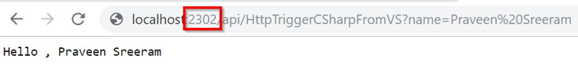 - Ahora, escribe la dirección URL completa de nuestro desencadenador de HTTP en el navegador. Debería tener el siguiente aspecto: http:// localhost:7071/api/HttpTriggerCsharpFromVS?name=Praveen Sreeram.