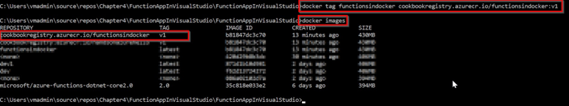 - El primer paso es asegurarse de que proporcionamos una etiqueta válida a la imagen con el comando docker tag functionsindocker cookbookregistry.azurecr.io/functionsindocker:v1. Ejecutar este comando no proporcionará ningún resultado. Sin embargo, para ver nuestros cambios, tenemos que ejecutar el comando docker images, como se muestra en la siguiente captura de pantalla: