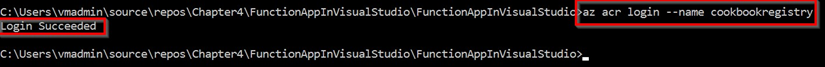 - El siguiente paso es autenticarte en el ACR con el comando az acr login –name cookbookregistry. Sustituye el nombre del ACR (en mi caso es cookbookregistry) por el de uno que hayas creado:
