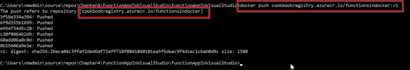 - Después de autenticarte, puedes insertar la imagen en el ACR ejecutando el comando docker push cookbookregistry.azurecr.io/ functionsindocker:v1, como se muestra en la siguiente captura de pantalla: