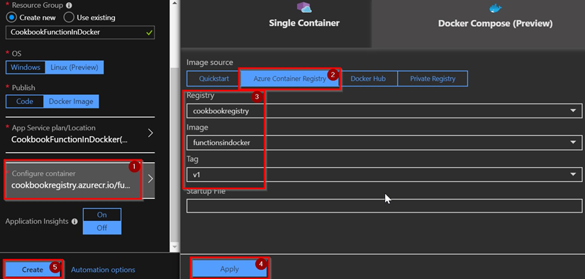 - Adjuntar la imagen de Docker desde el ACR (paso 2 de la guía anterior) a Azure Function (paso 3 de la guía anterior)