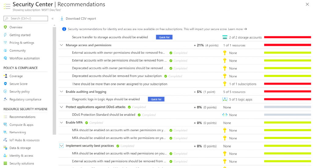 Azure, Azure Security Center brinda recomendaciones de seguridad para fortalecer la