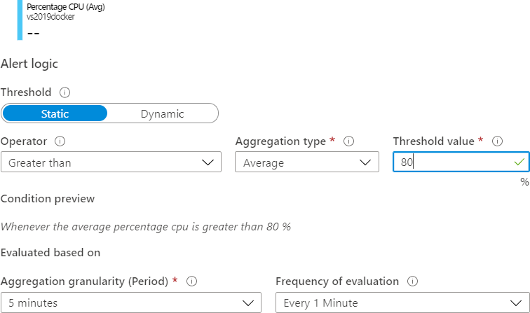 con un valor de umbral estático del 80 % para Porcentaje de CPU (promedio) y los